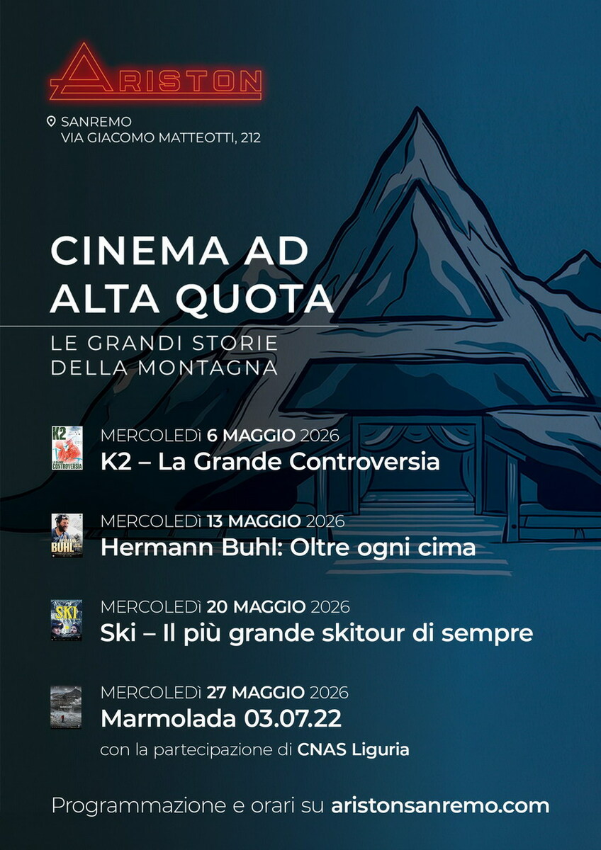 Per il mese di maggio, l’Ariston di Sanremo presenta la rassegna cinematografica “Cinema ad Alta Quota”, un viaggio attraverso alcune delle più straordinarie storie legate al mondo della montagna, tra avventura, sfida e riflessione. La rassegna si articolerà in quattro appuntamenti, in programma ogni mercoledì di maggio, proponendo al pubblico film e documentari di forte impatto visivo ed emotivo, capaci di raccontare l’alpinismo e la natura da prospettive diverse.