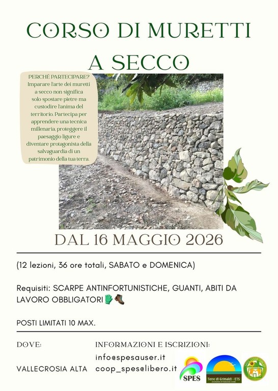 Spes APS, in collaborazione con l'Associazione Terre di Grimaldi, annuncia l'apertura delle iscrizioni per un nuovo corso pratico e teorico, focalizzato sulla costruzione e il restauro dei muretti a secco, antica tecnica ligure oggi classificata come Patrimonio Immateriale dell'Umanità dell'UNESCO.