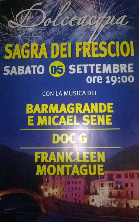 La tradizionale e tanto attesa ‘Sagra dei Frescioi’ si svolgerà questa sera, sabato 5 settembre, dalle 19 nel centro storico di Dolceacqua e in Piazza Padre Giovanni Mauro. Sono previsti diversi momenti musicali durante la serata, con i Barmagrande E Michael Seme , Doc G, Frankleen Montague.